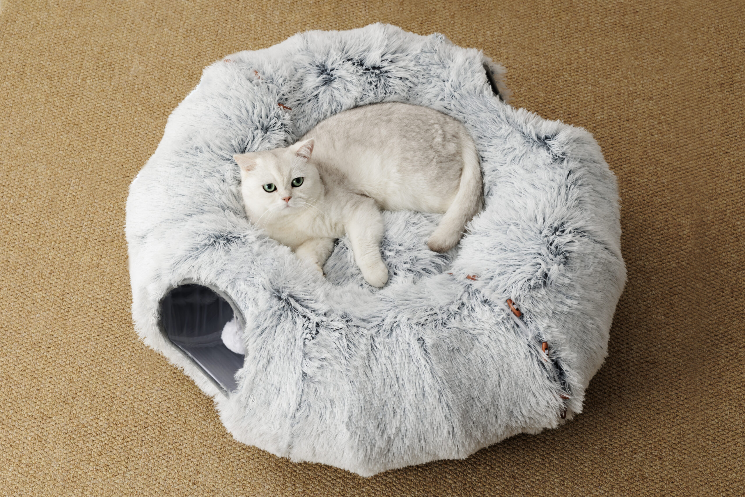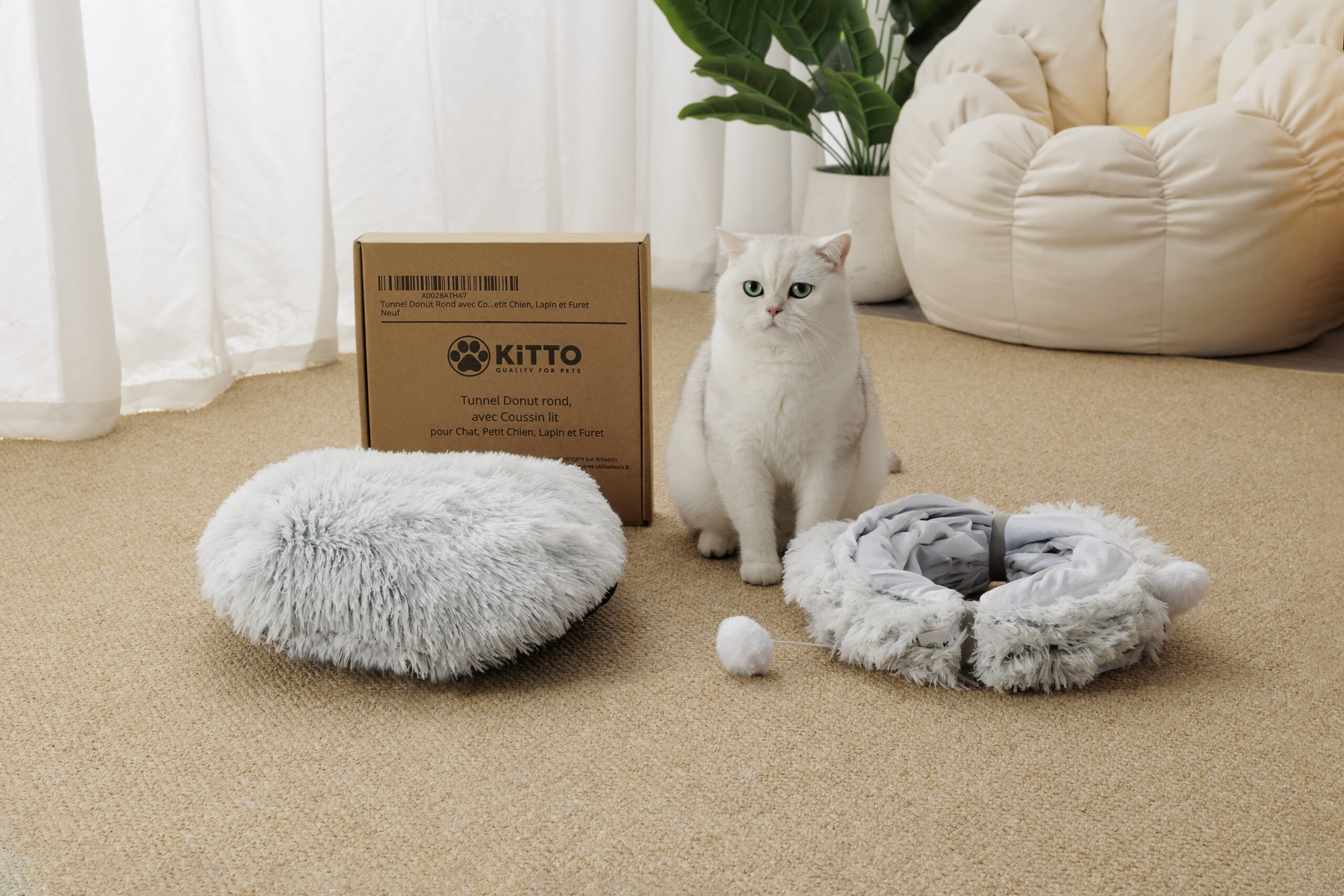 en rond, avec un coussin douillet au milieu, pour dormir, fixé avec des attaches